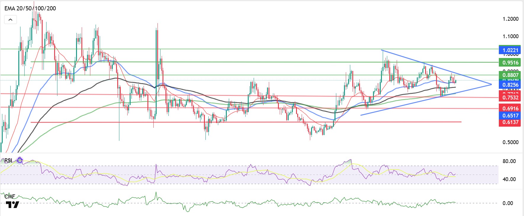 Technically, ADA continues to move within a tight symmetrical triangle channel band. The price may head towards the first resistance level of $0.9176 during the week, accompanied by rebound buying. If this level is broken, it is likely to reach the $0.9280 level, which is the peak of the rising channel within the major trend. The fact that the price is currently trading above all moving averages indicates that the uptrend is strengthening. Remaining above the 20-day exponential moving average (EMA-20, Red Line) and 50-day exponential moving average (EMA-50, Blue Line) levels is critical for the sustainability of the uptrend. The Relative Strength Index (RSI) has fallen to 49, approaching negative territory. On the other hand, the Chaikin Money Flow (CMF-20) indicator has fallen to 0.01, indicating continued selling potential in the market. The decline in cash inflows supports the CMF remaining in negative territory and creates a downward correlation with the RSI. From a technical perspective, confirmation signals for a buying effect have not yet emerged.