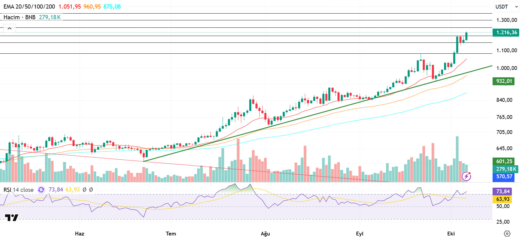 From a technical perspective, BNB/USDT, which ended its correction movement starting from the previous all-time high (ATH) of $1,083 at the $940 level, continued its rise with strong support from this region and reached new ATH levels.