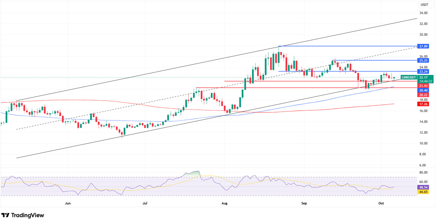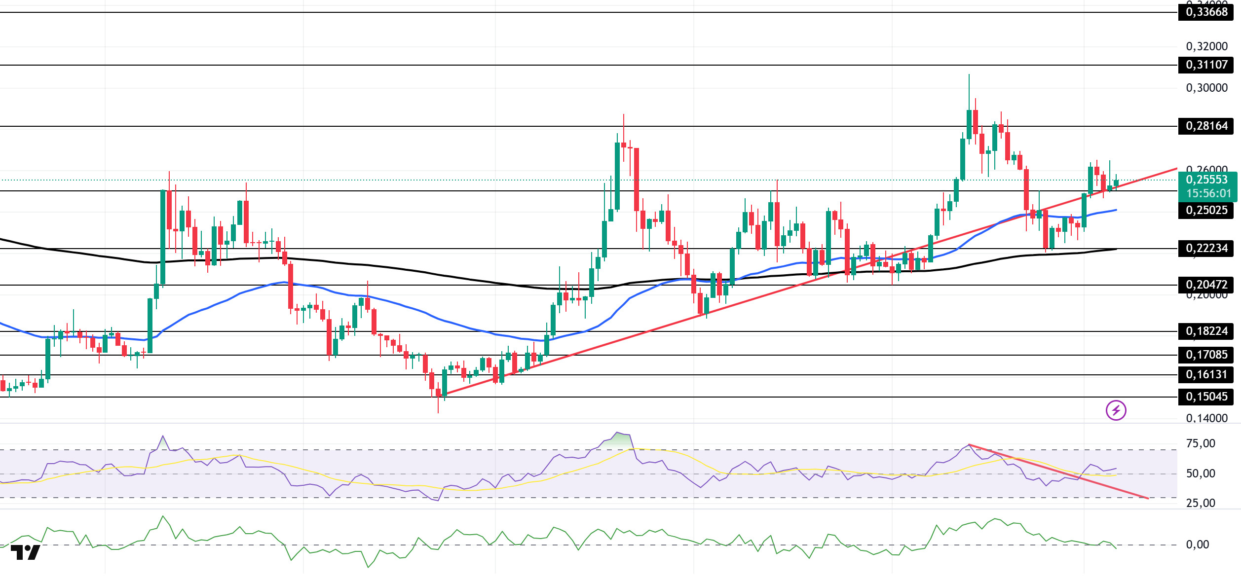 The asset is trading above the 50 EMA (Blue Line) and 200 EMA (Exponential Moving Average – Black Line) moving averages. This indicates that the asset is trending upward. On the other hand, the 50 EMA continues to be above the 200 EMA, indicating that the “golden cross” formation is continuing. This also signals that upward pressure may continue in the medium term. The Chaikin Money Flow (CMF–20) indicator has moved into negative territory. Money inflows continue to decline. This could push the CMF-20 deeper into negative territory. Looking at the Relative Strength Index (RSI-14) indicator, it has rebounded from negative to positive territory, moving towards the upper region of the downtrend that has been ongoing since September 13. This indicates that buying pressure is building. In the event of macroeconomic risks or negative news from the ecosystem, the $0.22234 level can be monitored as a strong support. On the other hand, if the upward movement gains strength, the $0.28164 level comes to the fore as the first strong resistance level.