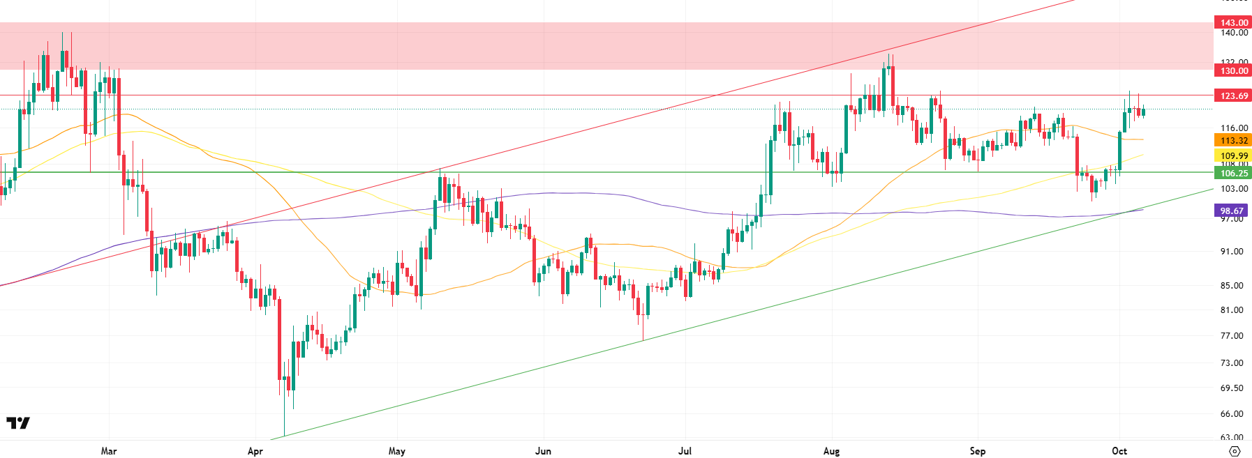 Following all these developments, looking at the daily technical outlook, BTC reached its 13th point with a golden cross formation and carried its ATH level to 125,500. BTC, which started its rally from the 109,000 level with the breakout of the downward trend structure at the end of September, continued in October, recording an increase of approximately 15%. Having managed to move the 9 and 11 levels it had previously tested upwards, BTC continues to maintain its major upward trend, stepping towards new peaks.