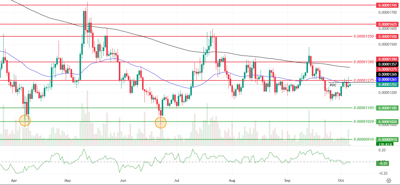 The short-term technical picture is mixed. Increased momentum and trading volume support a reactive rebound, while declining volatility keeps price action within a narrow range. The Chaikin Money Flow (CMF) moving into negative territory signals weakening capital inflows accompanying upward attempts, calling into question the sustainability of the rebound. Although last week closed above the Point of Control (POC) level of selling pressure became apparent at the first resistance level of $0.00001275, and the price fell below this week’s POC level of $0.00001265.