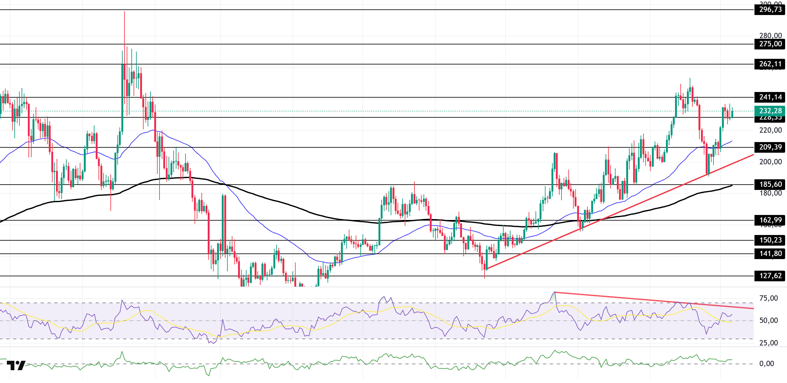 The asset is trading above the 50 EMA (Exponential Moving Average – Blue Line) and 200 EMA (Black Line) moving averages, indicating that the asset is in an uptrend. Furthermore, the 50 EMA remaining above the 200 EMA indicates the continuation of a technical “golden cross” formation. This shows that the medium-term upside potential continues. The RSI (14) has risen from negative to positive territory. At the same time, the indicator remained below the downward trend line that began on July 22. This indicates that selling pressure continues. The Chaikin Money Flow (CMF-20) remains in positive territory; at the same time, the increase in cash inflows could push the CMF-20 indicator to the upper levels of the positive zone. If macroeconomic data remains positive and developments in the ecosystem continue to be favorable, the first major resistance level of $262.11 could be retested. Conversely, in the event of potential negative news flow or deterioration in macro data, the $185.60 level could be monitored as a potential buying opportunity.
