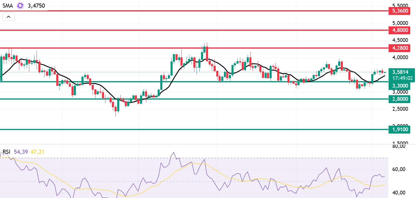 Looking at Sui’s technical outlook following recent developments, we see that the price has been moving sideways at around $3.58 on a weekly basis, influenced by fundamental developments. The Relative Strength Index (RSI) is currently in the range of 54.39 – 47.21. This range indicates that the market is trading close to the sell zone; however, if the RSI weakens and falls to the 35.00 – 40.00 range, it could signal a potential buying point. If the price moves upward, the resistance levels of $4.28, $4.80, and $5.36 can be monitored. However, if the price falls to new lows, it could indicate that selling pressure is intensifying. In this case, the support levels of $3.30, $2.80, and $1.91 come to the fore. Based on the trend line, a pullback to $2.80 appears technically possible. According to Simple Moving Averages (SMA) data, Sui’s average price is currently at $3.47. The price remaining above this level indicates that the current uptrend could technically continue.