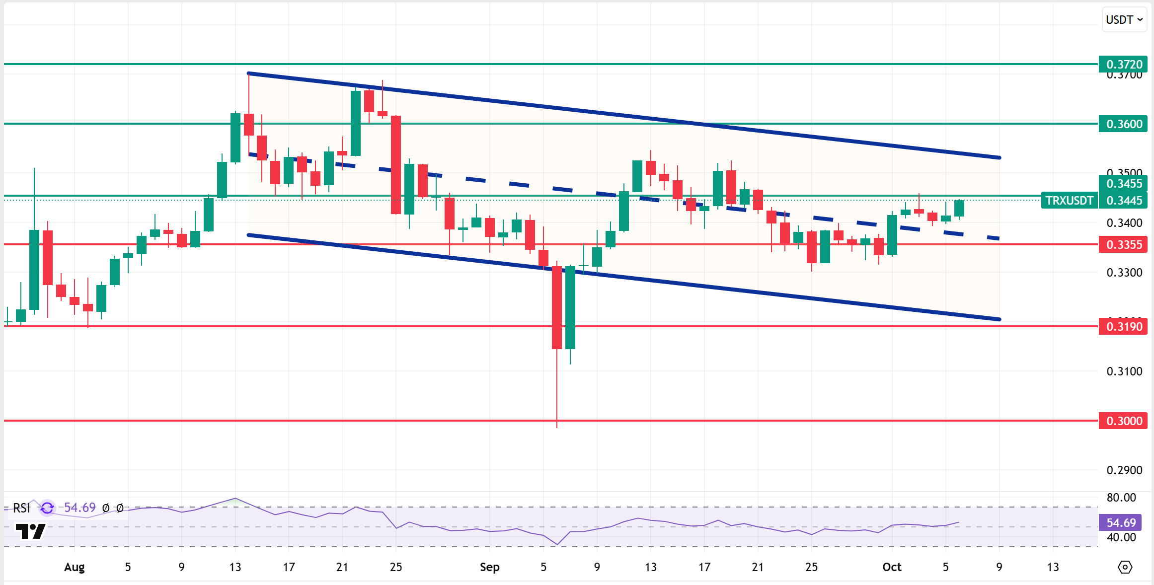 Technically speaking, TRX started the week at 0.3356 and rose approximately 2% throughout the week, closing at 0.3414. Thus, it ended the week with an increase, ending two consecutive weeks of decline, and its market value reached $32.3 billion. Currently trading at 0.3445, TRX is just above the middle band of the bearish channel on the daily chart and is attempting to break through the 0.3455 resistance level. The Relative Strength Index (RSI) value is observed to be in the buy zone at 54. Considering its position within the bearish channel and the RSI indicator, the TRX price may rise slightly. This indicates that it may move towards the upper band of the channel. In such a case, it may test the 0.3455 resistance level. If it closes above the 0.3455 resistance level, it may test the 0.3600 resistance level. If it fails to close above the 0.3455 resistance level and selling pressure increases in the market, it may decline due to potential selling from this area. In such a case, it may move towards the middle band of the bearish channel and test the 0.3355 support level. The 0.3000 level is being monitored as a critical support point on the daily chart. Staying above this level could maintain the upward trend, while closes below it could lead to increased selling pressure and deeper downward price movements.